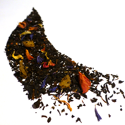 Ingrédients : thé noir du Mozambique 90%, mangue 6% (cubes de mangue: mangue, sucre; arôme naturel), figue 3% (arôme naturel) pétales de rose, bleuet et soucis.