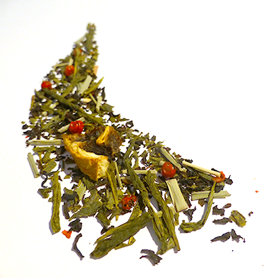 Ingrédients : thé vert de Chine 49%, thé noir du Mozambique 33%, baies rose 4%, citronnelle, arôme naturel de Pamplemousse 5%, zestes d’orange et de citron.