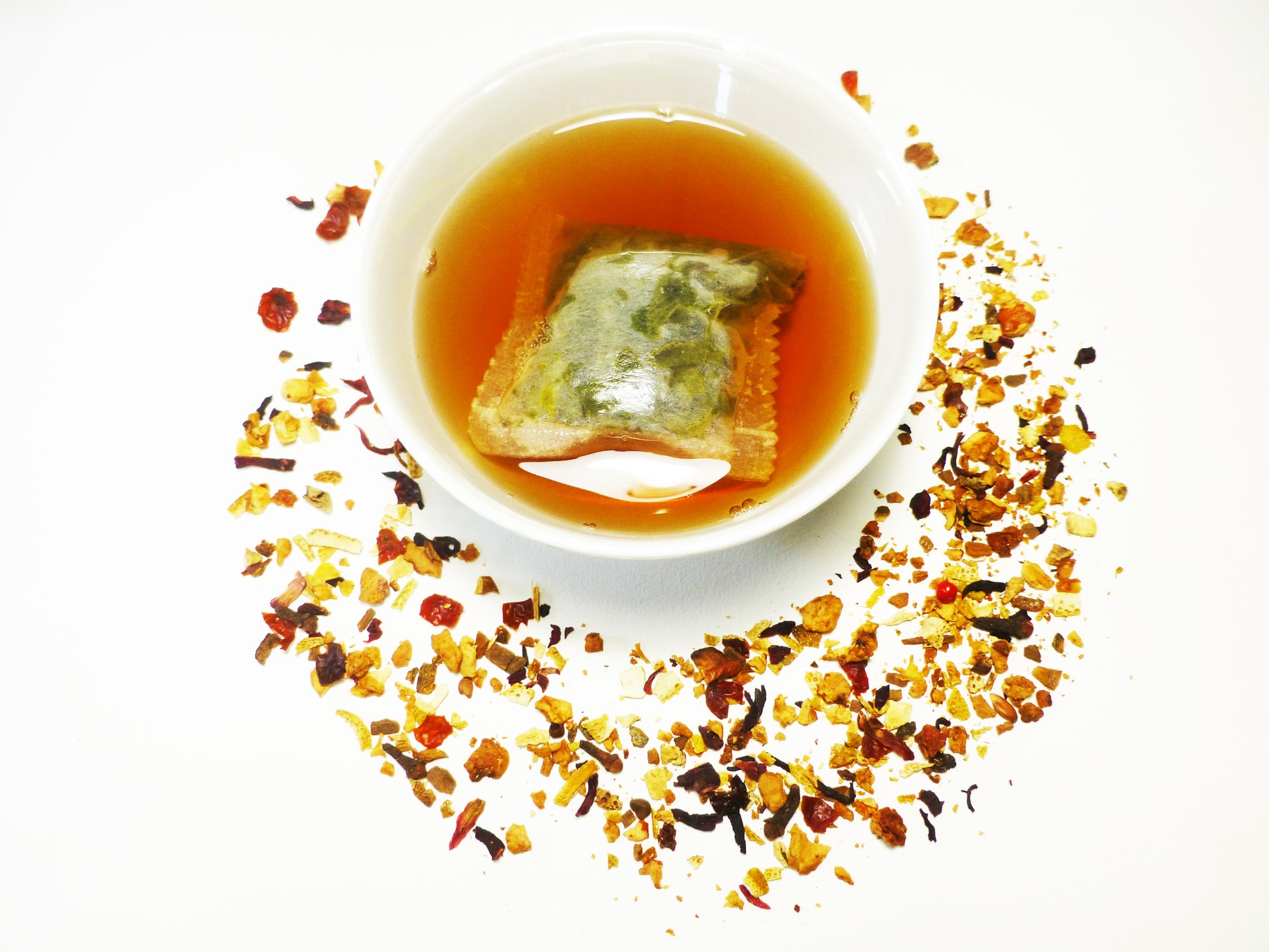 Ingrédients : pomme, cynorhodon, hibiscus, orange et citron (fruits et arômes naturels d'Orange et Citron vert), épices (cannelle, girofle, gingembre, poivre rose et arôme naturel).